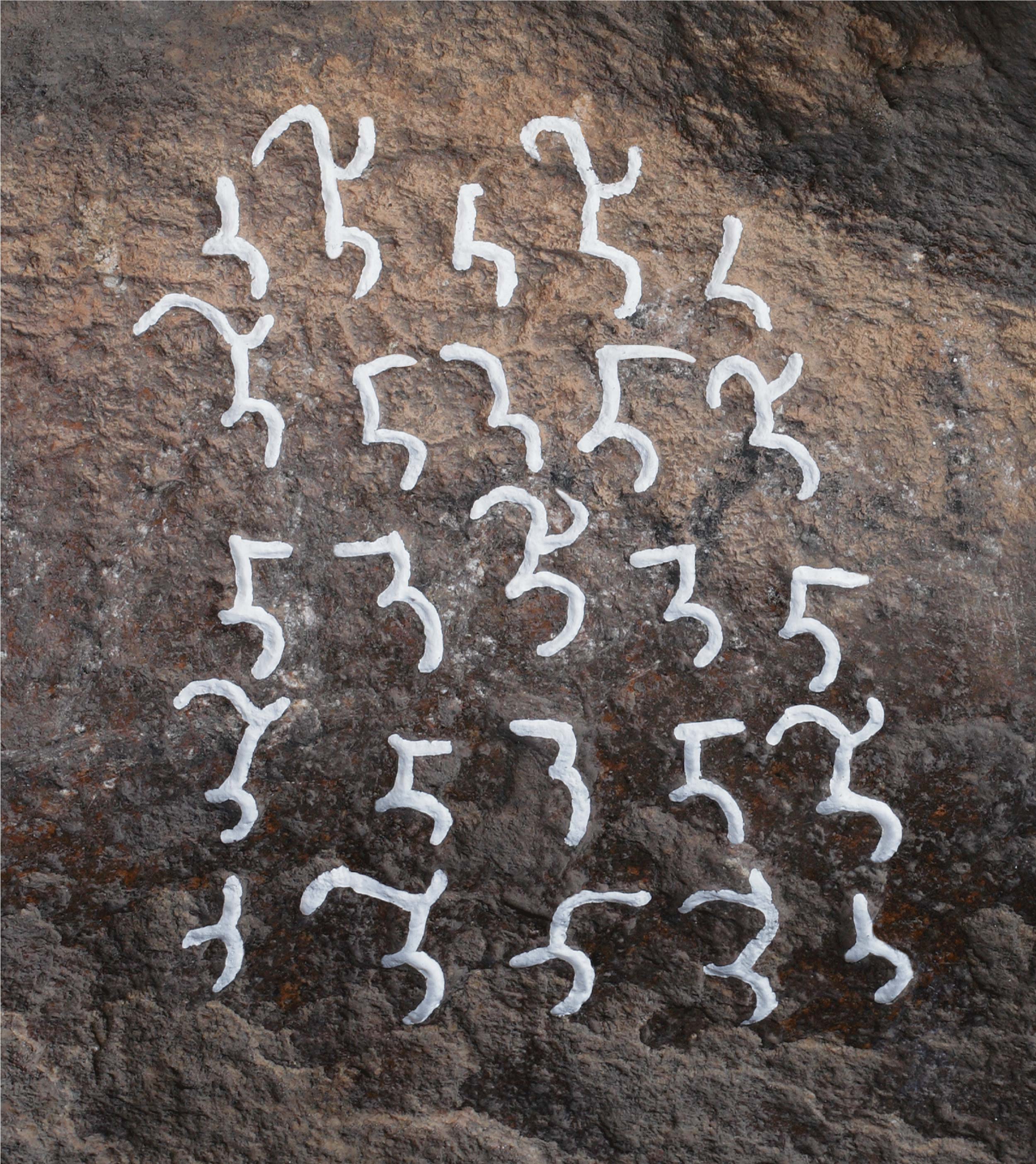 Above the stone bed at left in the cave; worn out but legible.