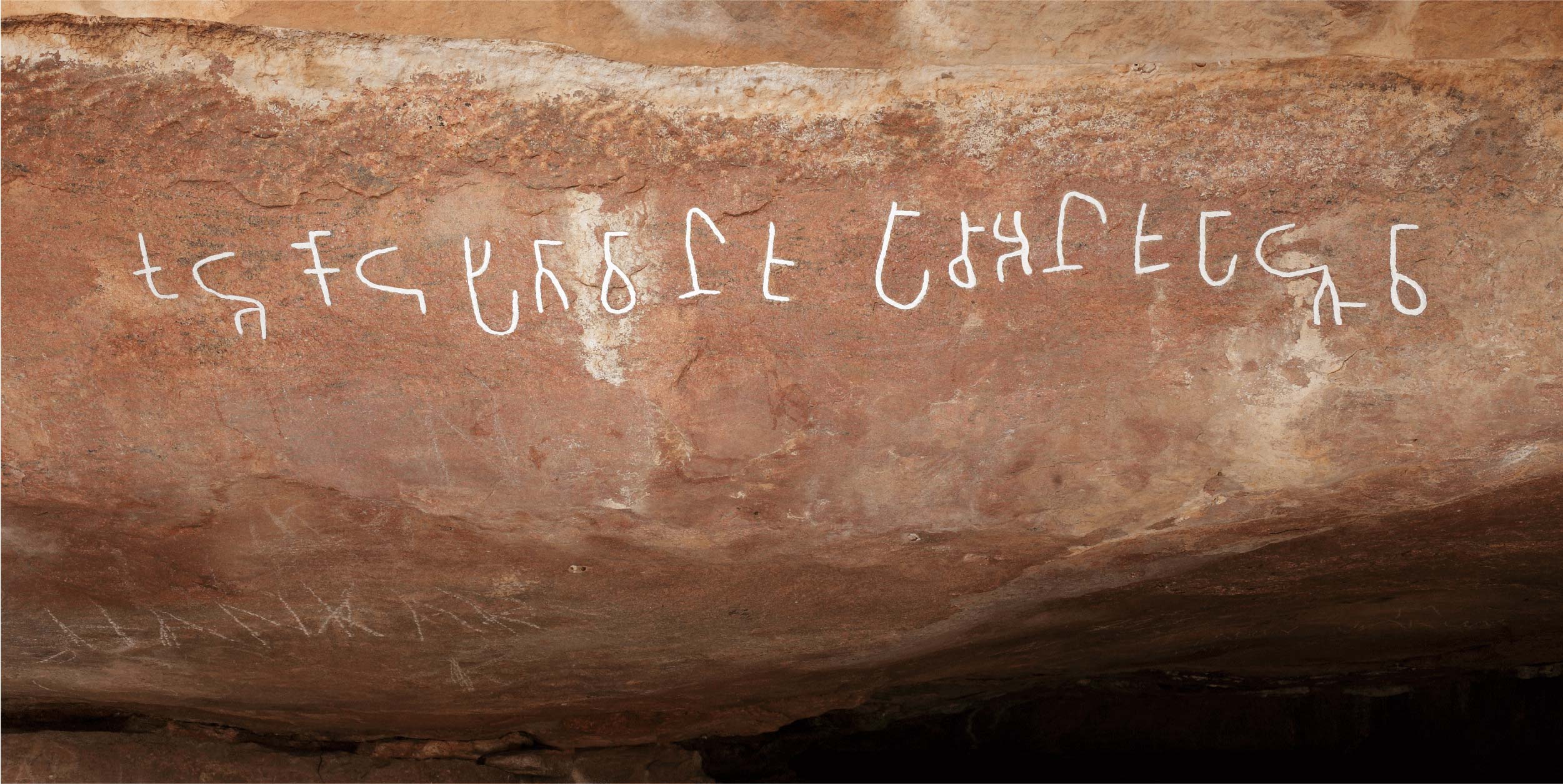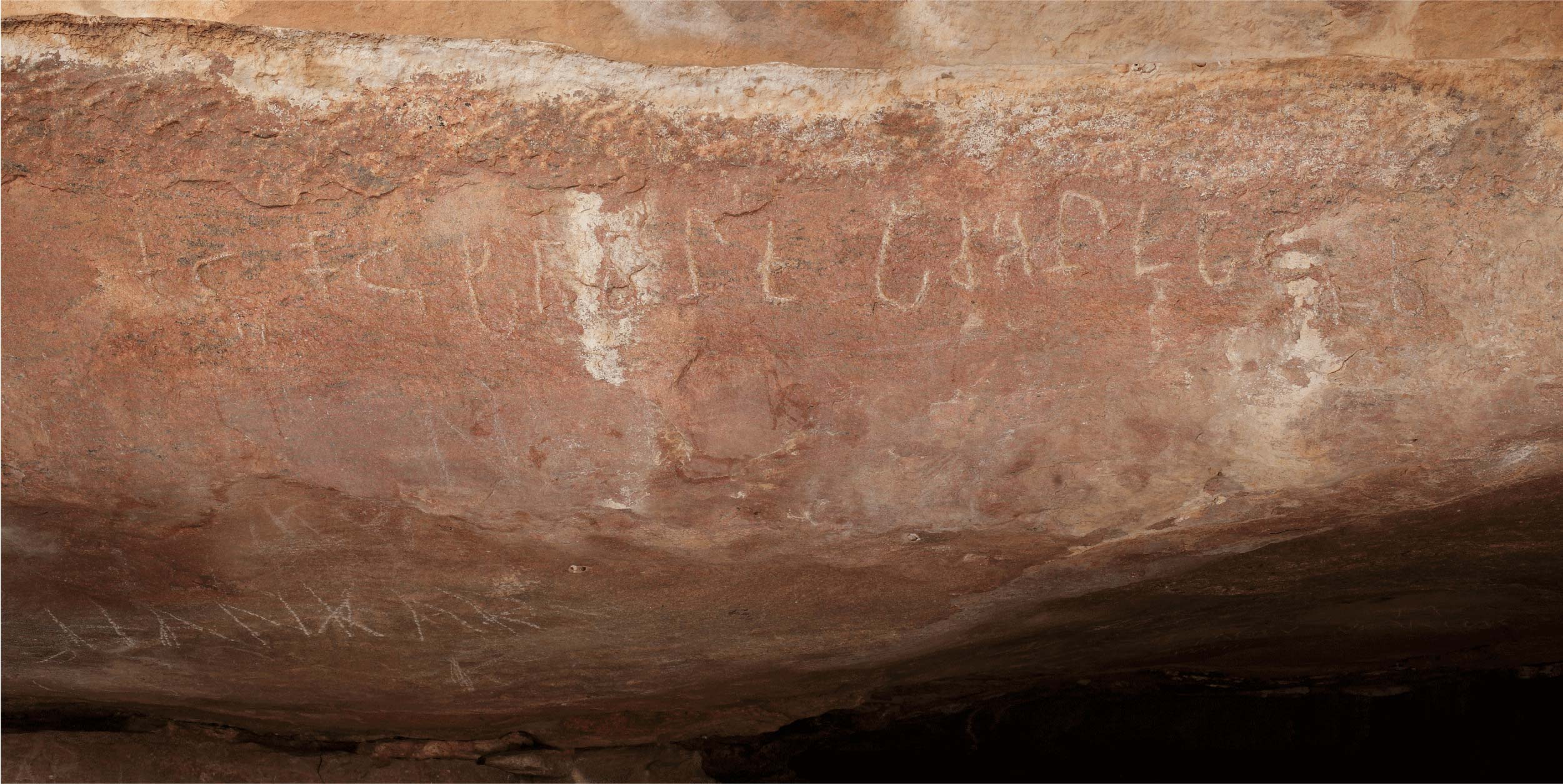 The first inscription (from left) on the brow of the cave on the Perumāḷkōvilmalai hill; incomplete at the end.