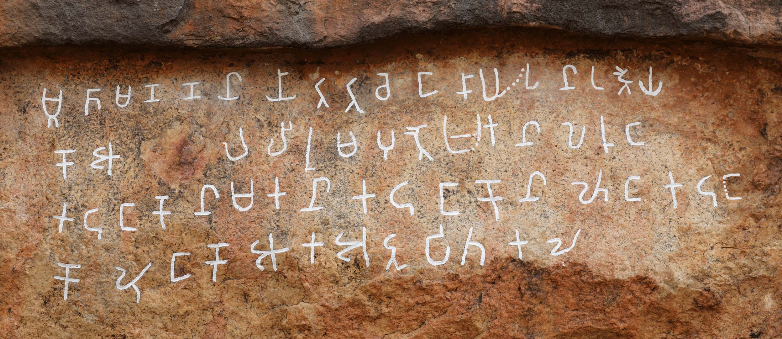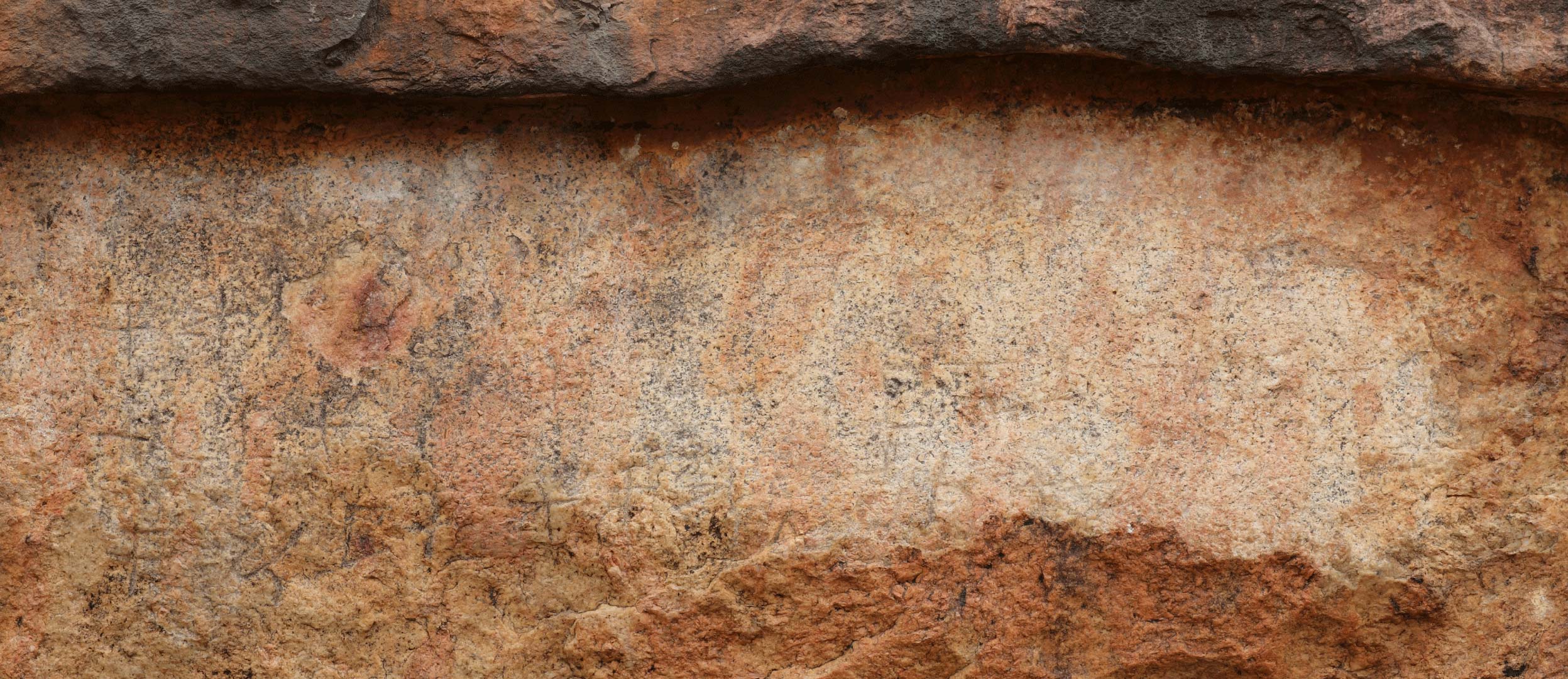 The upper inscription on the brow of the cave. L.1 is worn very thin due to weathering. L. 2 is damaged in the middle due to flaking of the stone. The upper inscription seems to have been engraved later than the lower inscription (61) when the height of the drip ledge was increased.